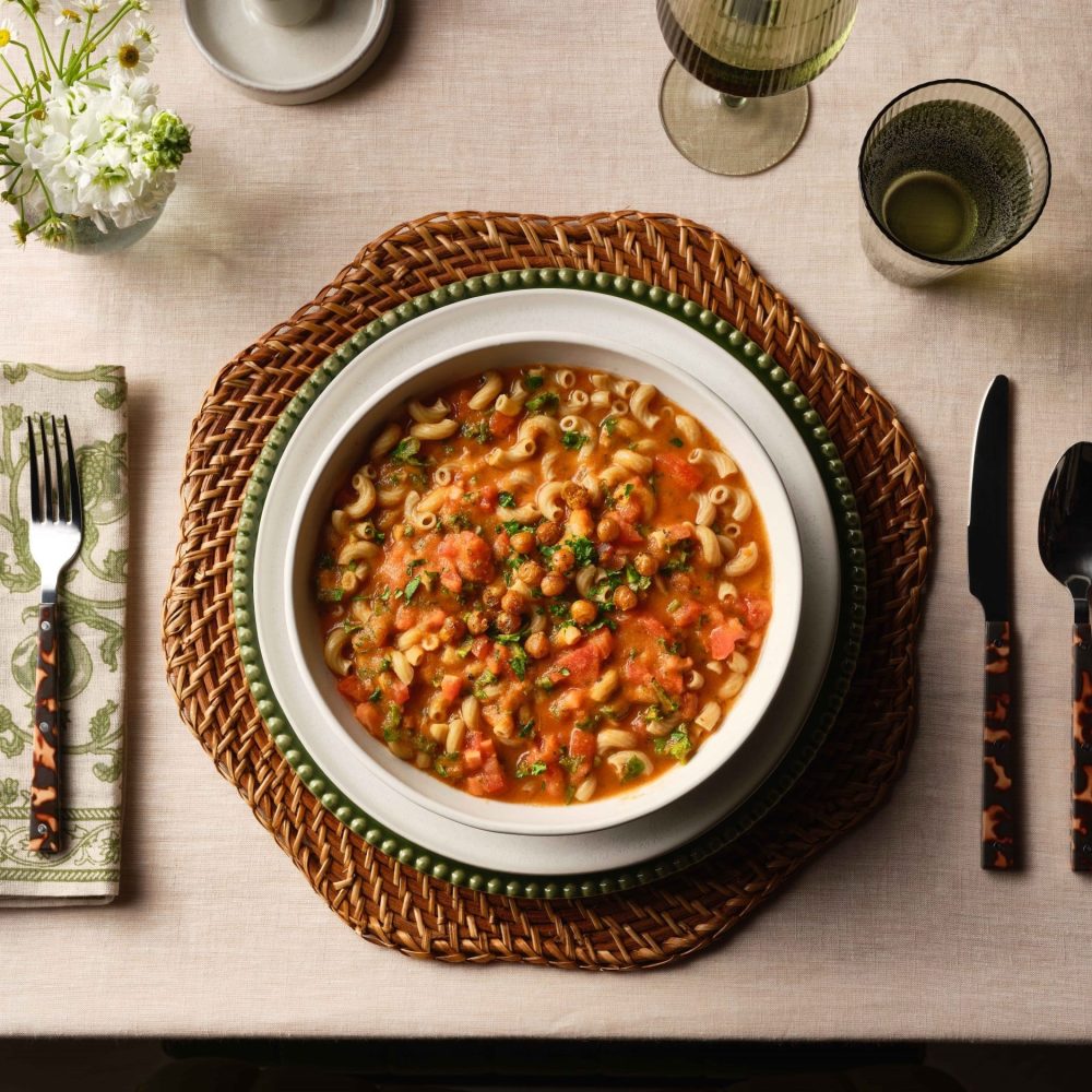 - Fördela makaroner jämnt i skålar. Häll soppan över och garnera med krispiga kikärter.